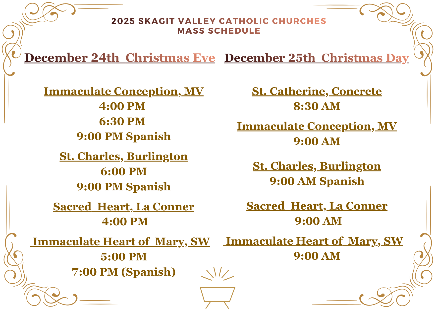 Welcome to the website of the Skagit Valley Catholic Churches! We are a family of four diverse and vibrant Catholic parishes, a mission, and a regional Catholic school in the beautiful Skagit Valley of Washington State. Whether living here or just passing through, we invite you to join us as we seek to joyfully and faithfully celebrate the Sacraments and proclaim the Gospel of Jesus Christ.