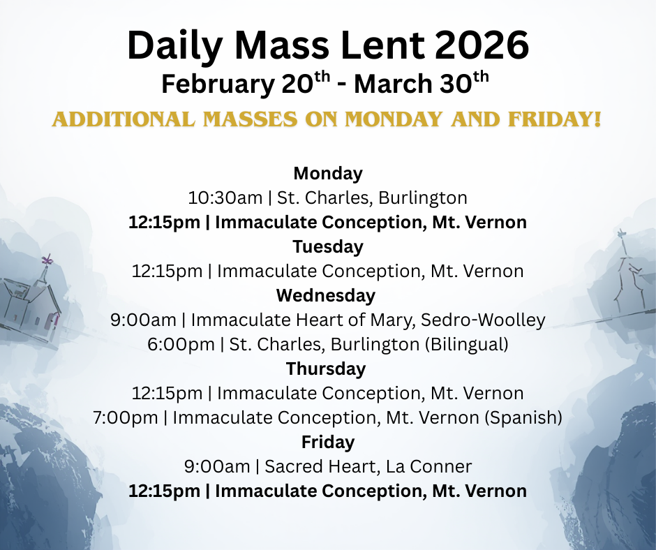 Welcome to the website of the Skagit Valley Catholic Churches! We are a family of four diverse and vibrant Catholic parishes, a mission, and a regional Catholic school in the beautiful Skagit Valley of Washington State. Whether living here or just passing through, we invite you to join us as we seek to joyfully and faithfully celebrate the Sacraments and proclaim the Gospel of Jesus Christ.
